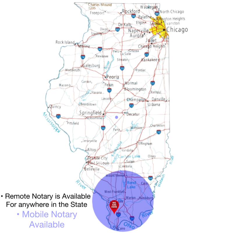 At Springville Hill we offer a variety of services including remote, mobile, and on-site notary serves. Allowing us to offer notarial services to anyone in Illinois, So no matter where you are located in Illinois we are near you, with our remote notary option. We are located in Union County in Southern Illinois within an easy driving distance of Jonesboro, Anna, Tamms, Dongola, Ullin, Cobden, Lick Creek, Mounds, Cairo, Carbondale, and more! We strive to have the best notary services around.